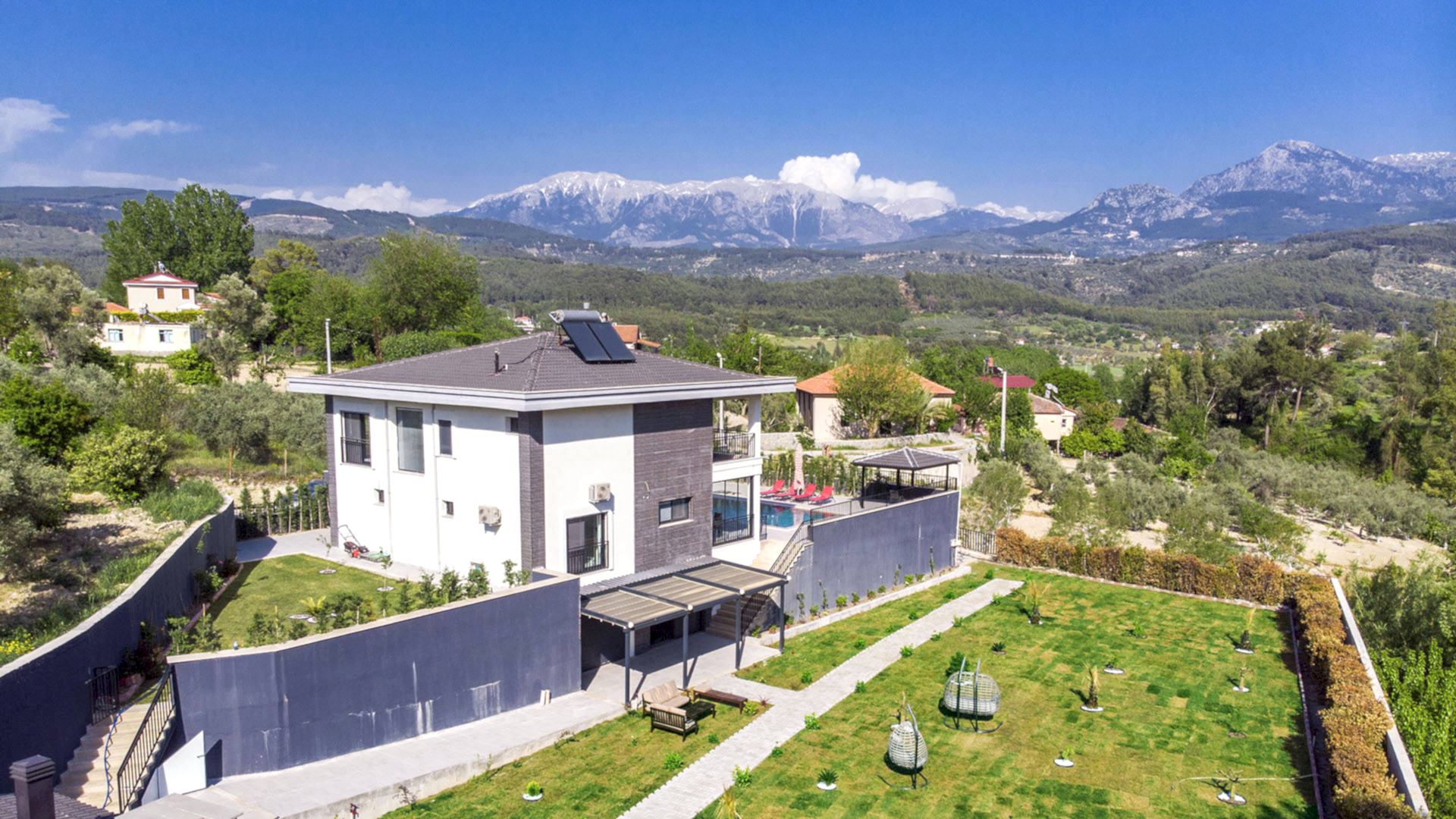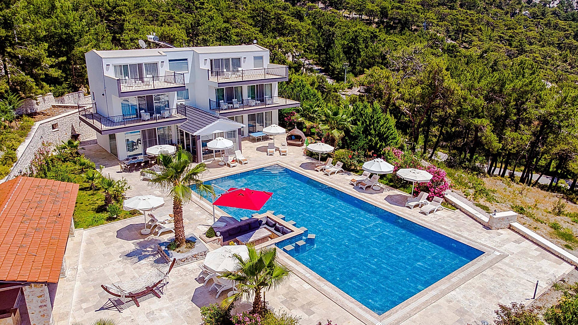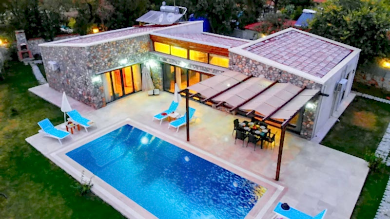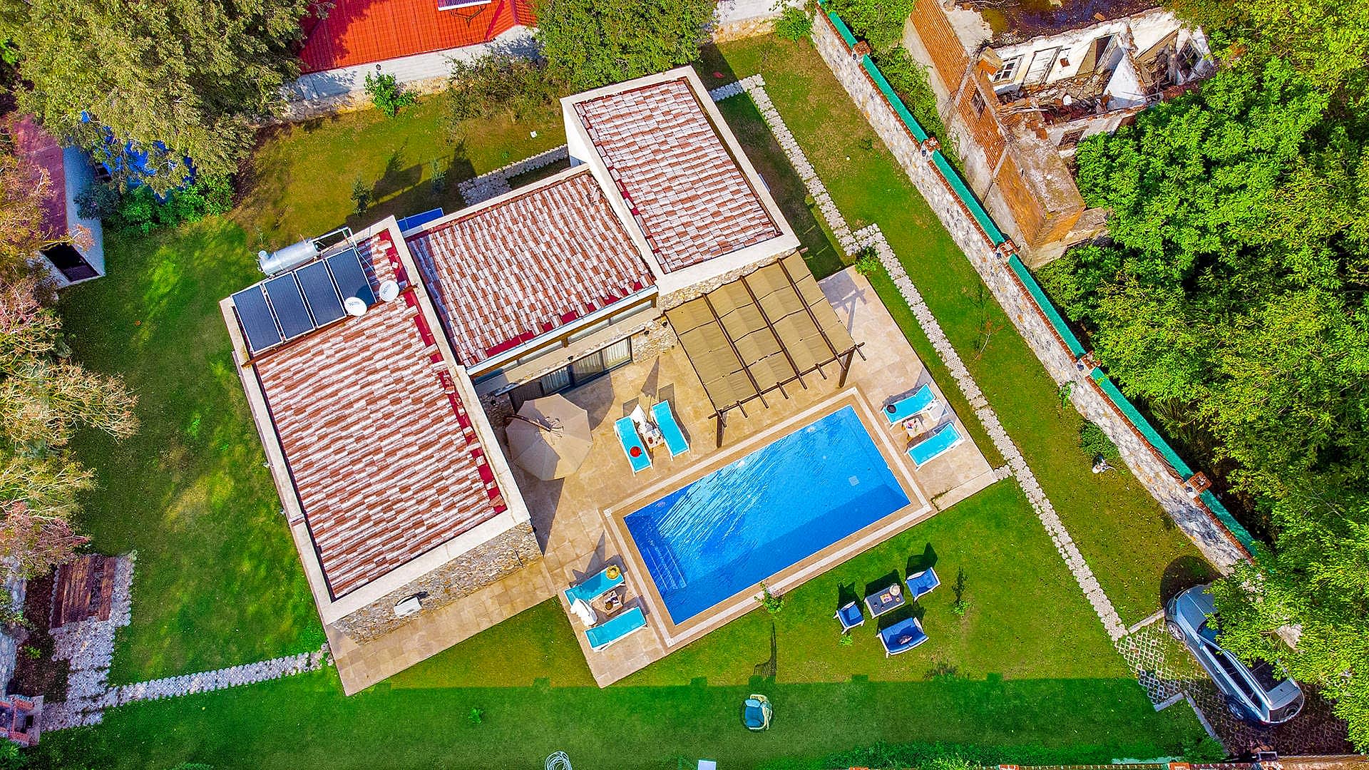 Drone ile yapılan dış mekan fotoğraf ve video çekimlerinde, villanın genel görüntüsünü ve konumunu anlamnıza yardımcı olur,